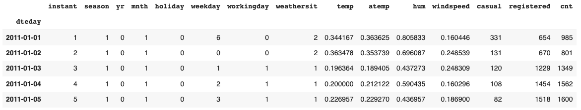 import requests import zipfile import io import pandas as pd content = requests.get("https://archive.ics.uci.edu/ml/machine-learning-databases/00275/Bike-Sharing-Dataset.zip").content with zipfile.ZipFile(io.BytesIO(content)) as arc: raw_data = pd.read_csv(arc.open("day.csv"), header=0, sep=',', parse_dates=['dteday'], index_col='dteday') raw_data.head()