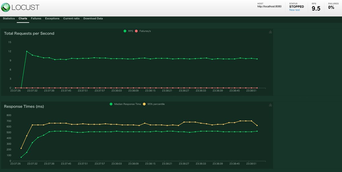 描画されるグラフには1秒でどれだけのリクエストを処理できたのか(Request per Second)や リクエストを処理するのにかかった時間 Request Times などがあります。とくに Request Times では 95% tile での処理時間も描画されるので突発的に遅くなるような挙動についてもチェックできます。