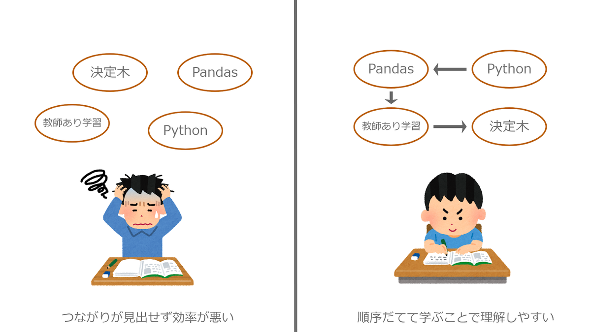 単純な回帰問題から始まり、言語の分析があったり、画像の解析があったり、分析するテーマで学習すべき内容が乱立しています。